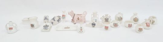 Collection of Goss crested china and other crested ware to include a model of a boat, miniature vases, a cow creamer, a tyg, a tree ring and other items