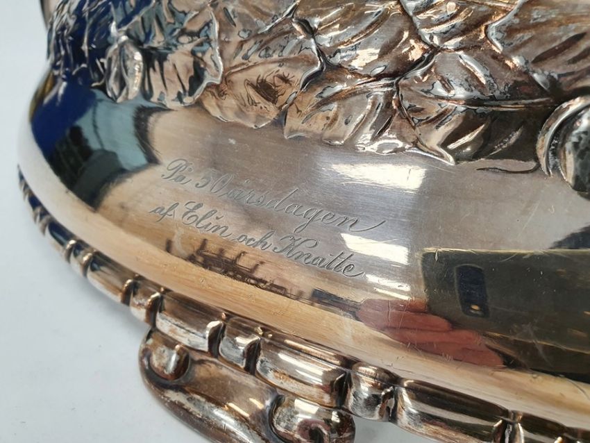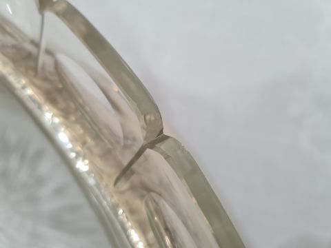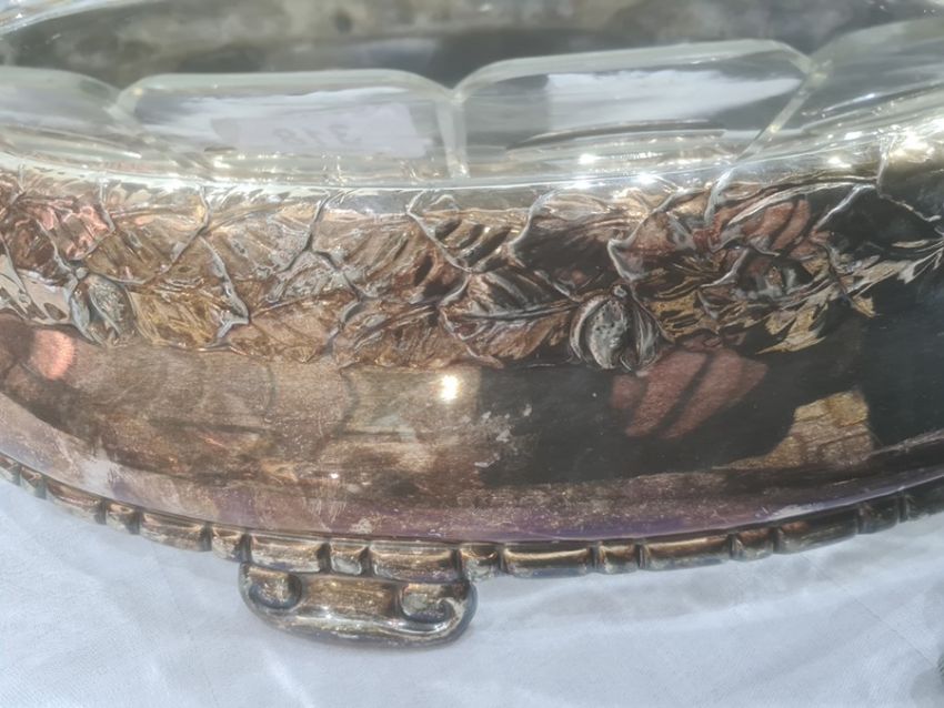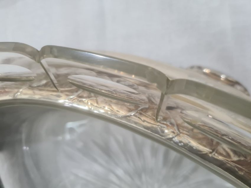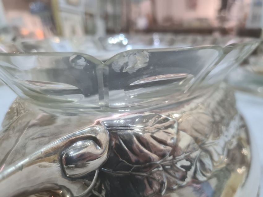 There are quite a few chips to the top of the glass. There is some scratching and wear to the silver-plated bowl. See attached images