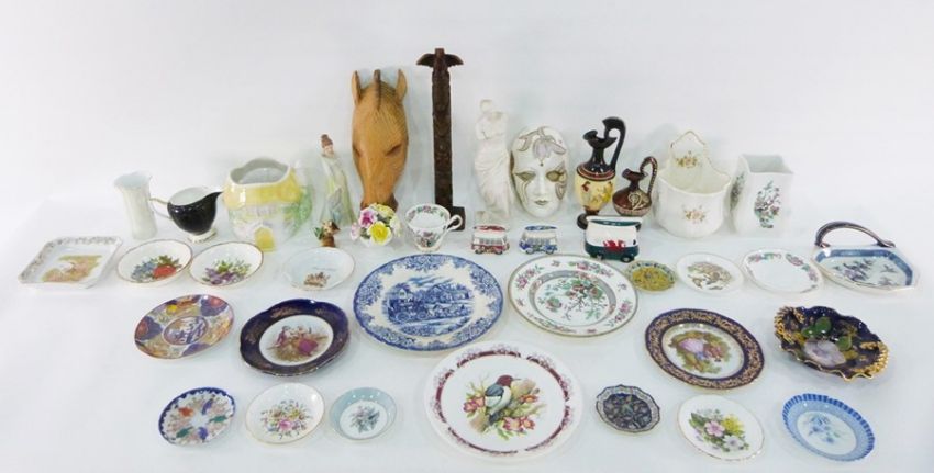 Assorted collectables and ceramics to include vase, mini camper van marked with a Welsh dragon, carved wooden totem pole and 12-piece drain rod set