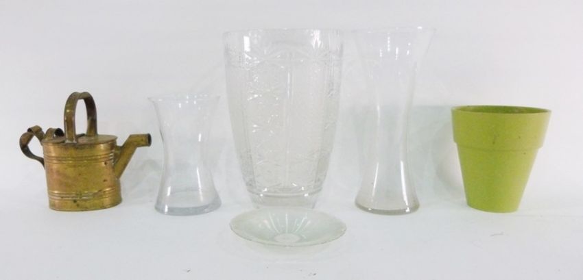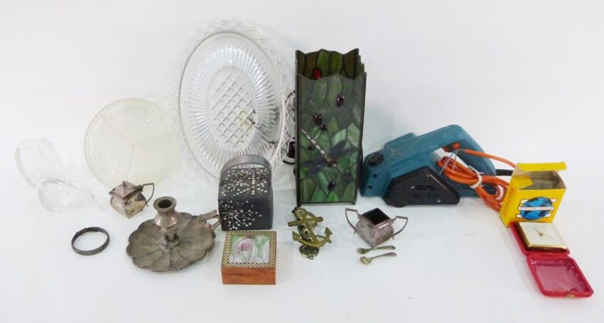 Two boxes of assorted glassware, Tiffany-style lamp and Black & Decker electric plane (3 boxes)