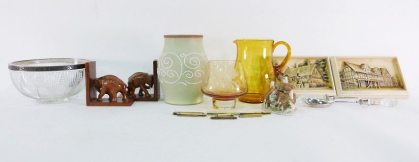 Camelot Ironstone Washington pottery part tea service, a comport, ornaments, assorted prints, carved elephant bookends, large pottery vase and two framed hunting prints (2 boxes plus prints)