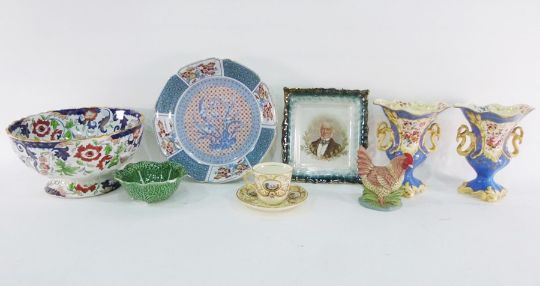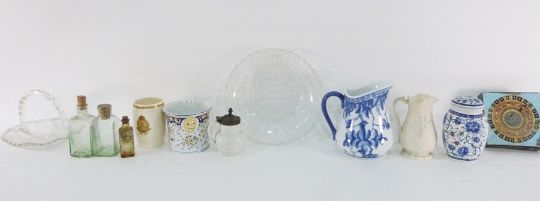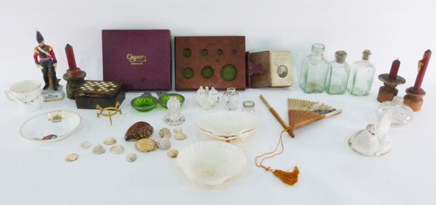 Caspari bridge set, assorted collectables, pressed glass dish 'Give Us This Day Our Daily Bread', various ceramics, ceramic model of chicken, three scallopshells and a collection of shells (2 boxes and a telescope and tripod