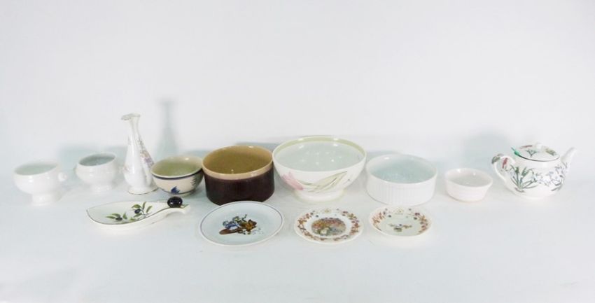 Various cabbage leaf plates marked 'Made in Portugal', ceramic rabbit vase, Whittard 'The Chatsford' teapot, souffle dishes and other ceramics (2 boxes)