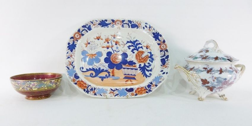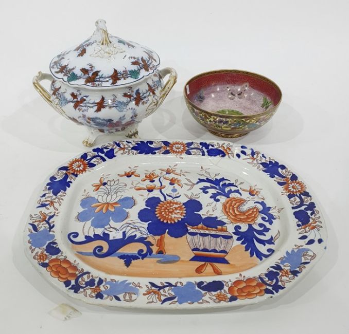 Maling lustre bowl, the interior decorated with butterflies, the outer rim with dragonflies, the rim is chipped and repaired in places, a large Japan pattern meat dish and a late 19th c. large lidded, two handled tureen, with damage and repairs (3)