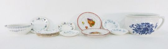 Moulded glass cake plate in original box, marked 'Annette', assorted prints, a sewing basket, a Tempora carriage clock, a table lamp, Noritake Contemporary 'Blue Hill' part service and other assorted ceramics to include Colclough, etc (3 boxes)