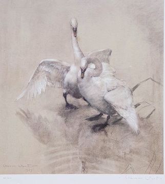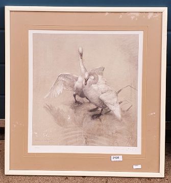 Pair of swans, 62/500, signed in margin, framed, other framed prints, unframed maps, etc