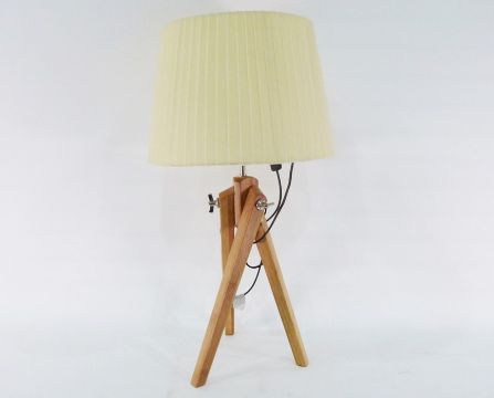 Table lamp formed as a wooden tripod with adjustable legs