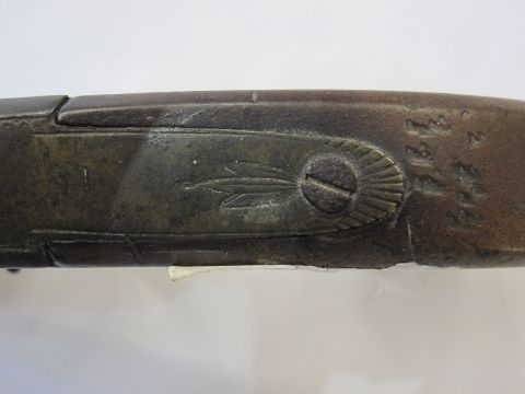 19th century flintlock table lighter with engraved brass mounts and mahogany scroll handleCondition ReportPlease see additional imagesBrass and iron constructionNot aware of any missing parts