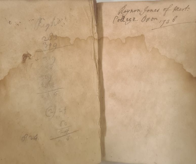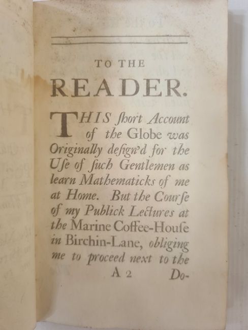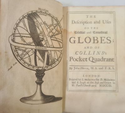 Harris John " The Description and Uses of Celestial and Terrestrial Globes and Collins's Pocket Quadrant" E. Midwinter 1703, engraved frontis, ink inscription ffep 'Roynan Jones of Mert: College Oxon 1738', water damage on endpapers back and front and inside boards, contemp full calf, front hinge crackedBOOKS NOT COLLATED UNLESS OTHERWISE STATED, PLEASE ENSURE YOU ARE SATISFIED BEFORE YOU BID
