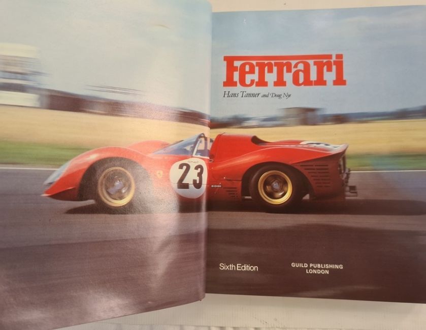 Tanner, Hans and Nye, Doug " Ferrari" sixth ed. Guild publishing London 1985, red boards. d-j. ills throughout, " 2000 Ferrari's Year" , " Ferrari 1947 -1957 photograph, 1998 wall calendar, with  a miniature wood cricket bat , signed by both teams Glouc v Somerset 20th July 1986 in fitted boxBOOKS NOT COLLATED UNLESS OTHERWISE STATED, PLEASE ENSURE YOU ARE SATISFIED BEFORE YOU BID