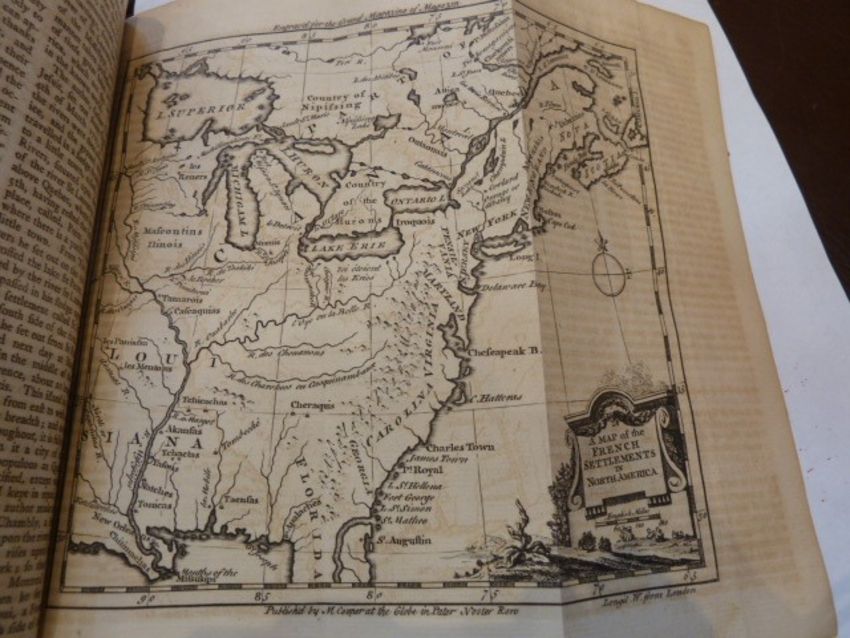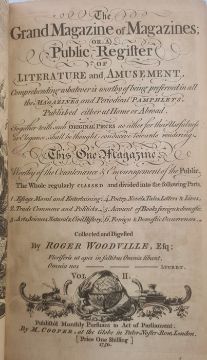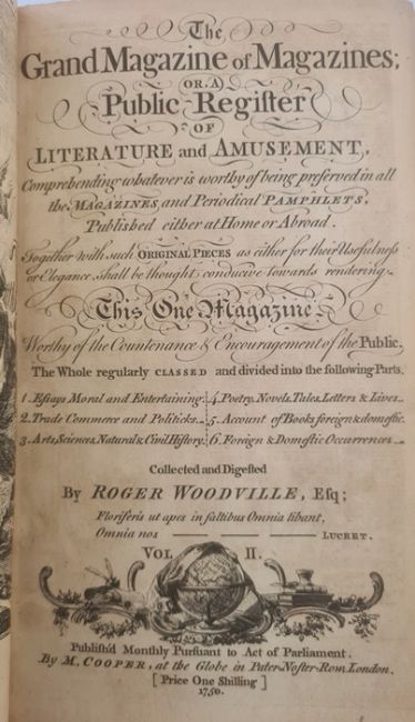 Woodville, Roger " The Grand Magazine of Magazines or, a Public Register of Literature and Amusement ...for the Year 1751..."  M. Cooper 1750 ( 1751) , pirated printing of Thomas Gray  'Elegy in a  Country Churchyard'  April, engraved frontis, folding engraved plates, one a map of The French Settlements in  North America, rebound quarter leather, marbled boards, gilt title on red pastedownBOOKS NOT COLLATED UNLESS OTHERWISE STATED, PLEASE ENSURE YOU ARE SATISFIED BEFORE YOU BID