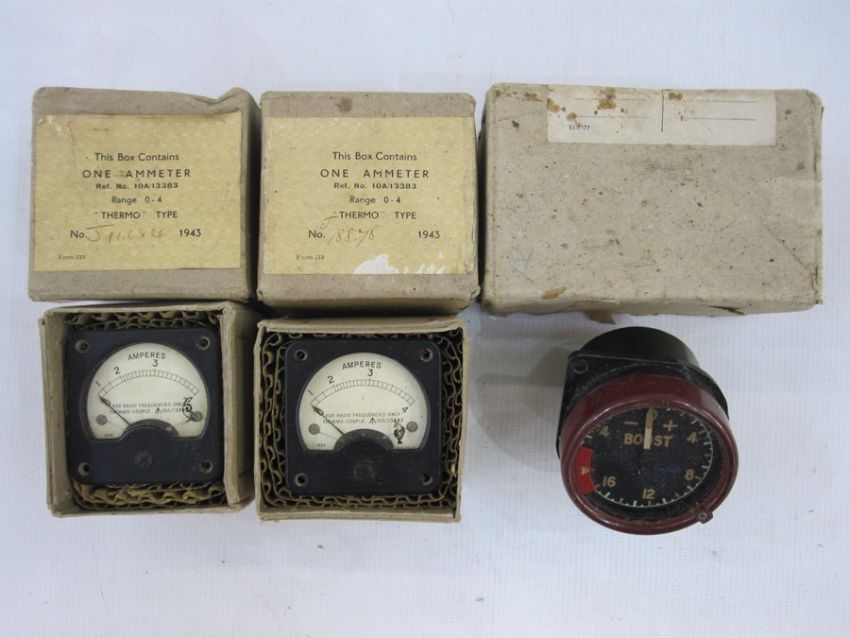 Boxed ammeter Ref.No. 10A/13383 range 0-4, "Thermo type" 1943, boxed (2) together with a Smith's Aircraft Instruments Ltd boost gauge, Mark IIIK, dated 12 June 1945 in original  box (3)