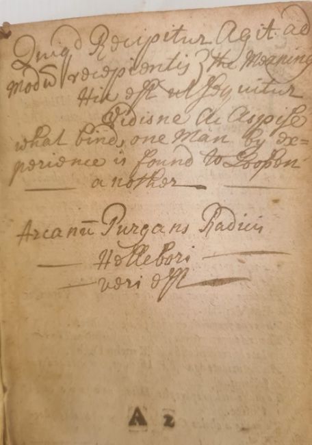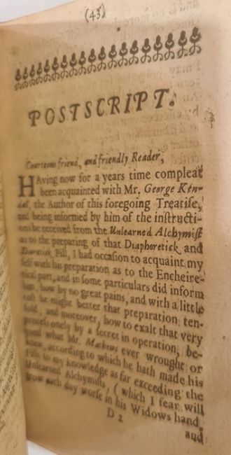 Matthew, Richard " The Unlearned Alchymist His Antidote or A more full and ample explanation of the Use, Virtue and Benefit of my Pill......... Mr Richard Mathew's Pill .....recorded in writing in his own hand 1659...." London Joseph Leigh 1663, with Mr George Starkey's testimony that he devised the recipe in 1651, ink notes on ffep, contemporary full calf, all rather bumped and worn, some foxing and slight worm damagewith the base of the backstrip splitting.We are fairly comfortable that the book is complete.....BOOKS NOT COLLATED UNLESS OTHERWISE STATED, PLEASE ENSURE YOU ARE SATISFIED BEFORE YOU BID