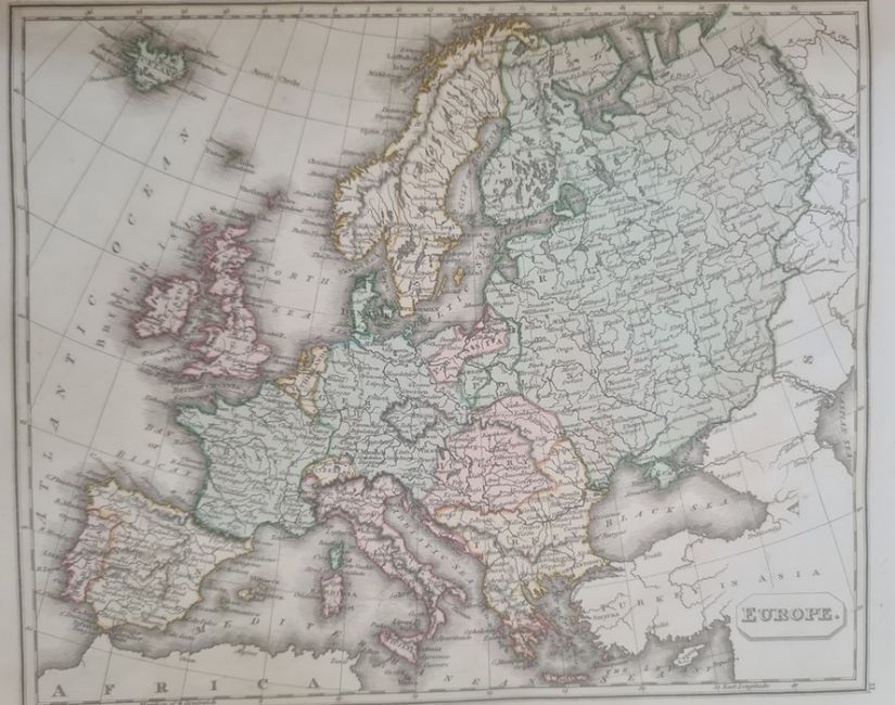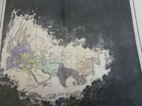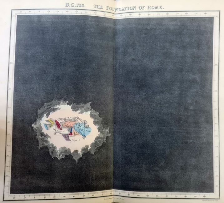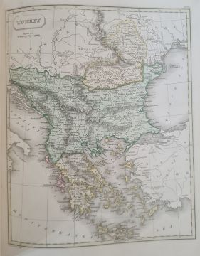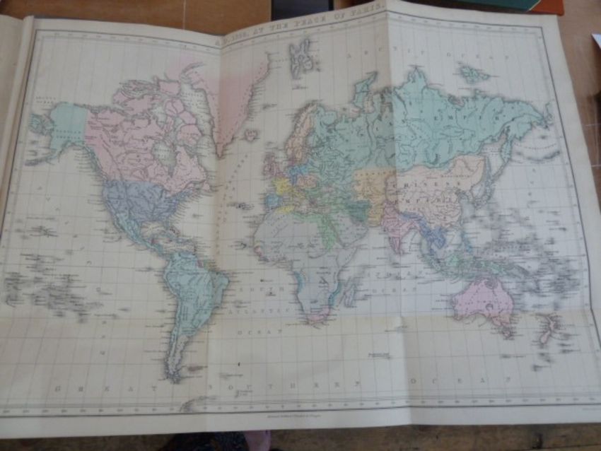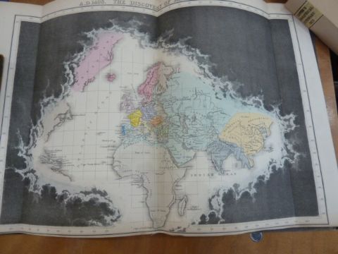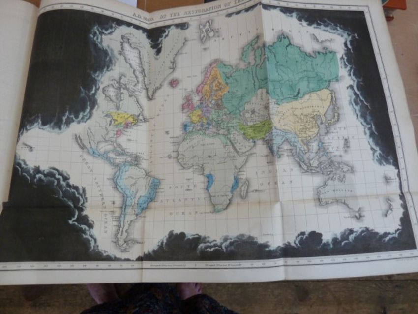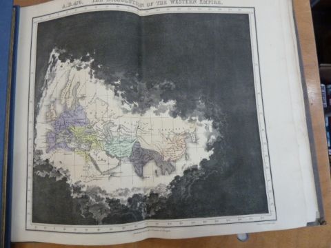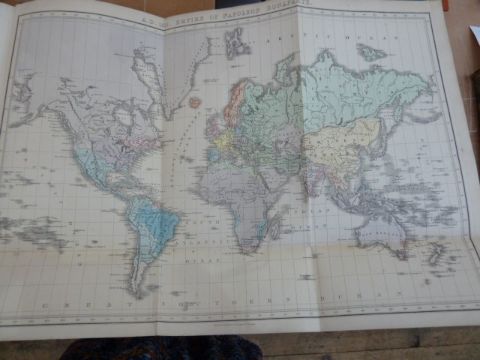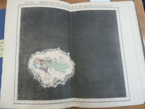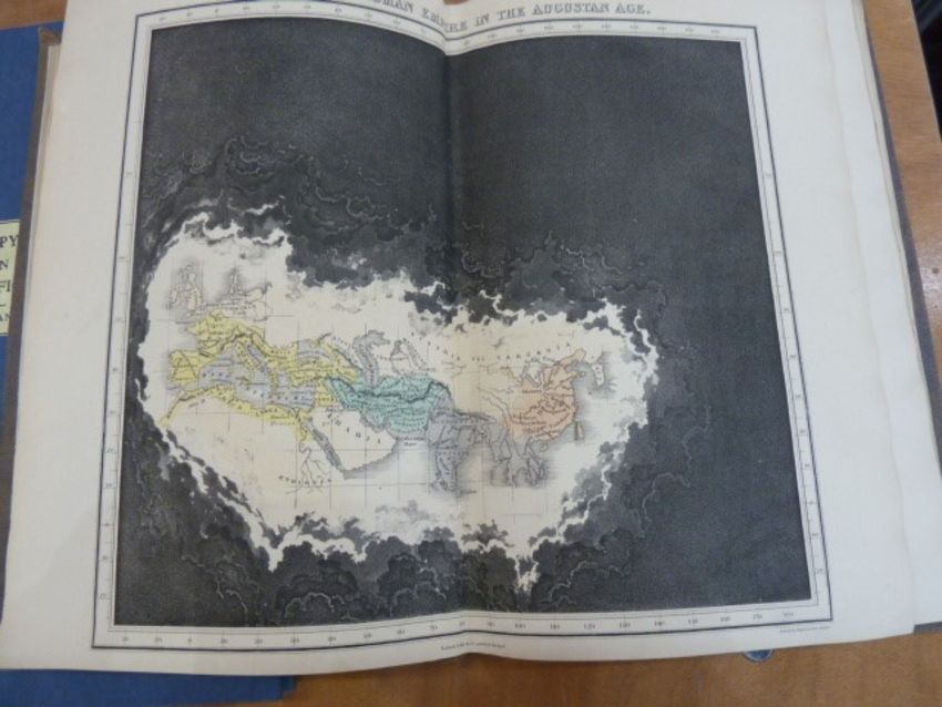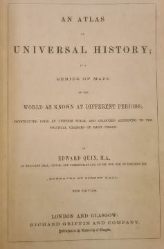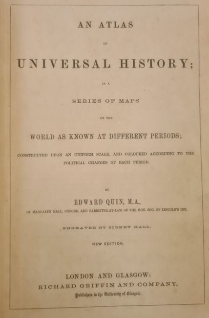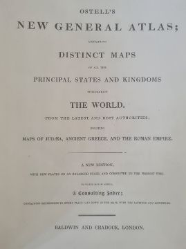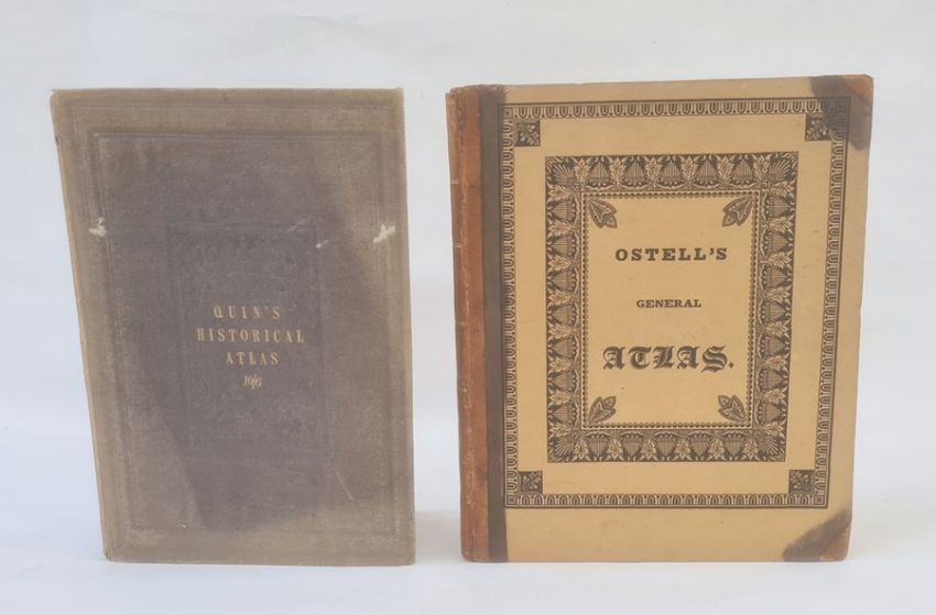 Quin Edward " An Atlas of Universal History;  in a series of maps..." engraved by Sidney Hall, New Edition, Richard Griffin and Company [1857] 21 handcoloured maps by Gilmour and Dean, either double page or folding, publisher's blind stamp cloth with gilt titles and price to front board, boards faded and worn, please see further imageswith Ostell's "New General Atlas...." new edition , Baldwin and Cradock [1830], 30 hand coloured maps, two double page, originalhalf calf, boards, some staining to the corners and back strip  (2)BOOKS NOT COLLATED UNLESS OTHERWISE STATED, PLEASE ENSURE YOU ARE SATISFIED BEFORE YOU BIDCondition ReportQuin's Atlas - 21 maps as required, maps clean, some foxing and offsetting not affecting the maps, slight tear in the fold by the hinge of 1660 AD Restoration.... and also AD 1555.Ostell  - dated on ffep 1833, some offsetting, not affecting the maps and all present