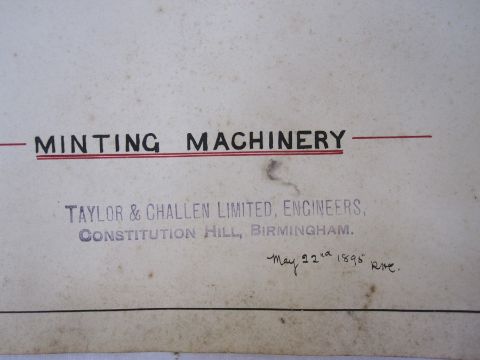 'Coining Press 688' drawing plan, dated 14/3/05, by Taylor & Challen Ltd, Engineers, Constitution Hill, Birmingham, a Glasgow International Expedition 1901 drawing plan, allotment no.22-Taylor & Challen Ltd, order no.9928, 57/13, a drawing plan 'Arrangement of Foundations of 16ft Water Wheel for Waltham Abbey', 13/3/91 and a drawing plan 'Minting Machinery', Taylor & Challen Ltd, Engineers, Constitution Hill, Birmingham, May 22nd 1895 (4)