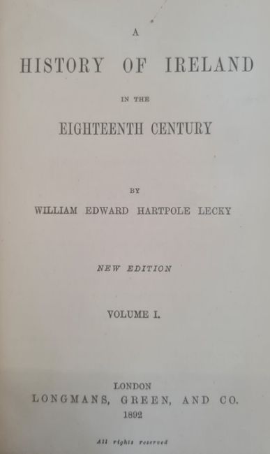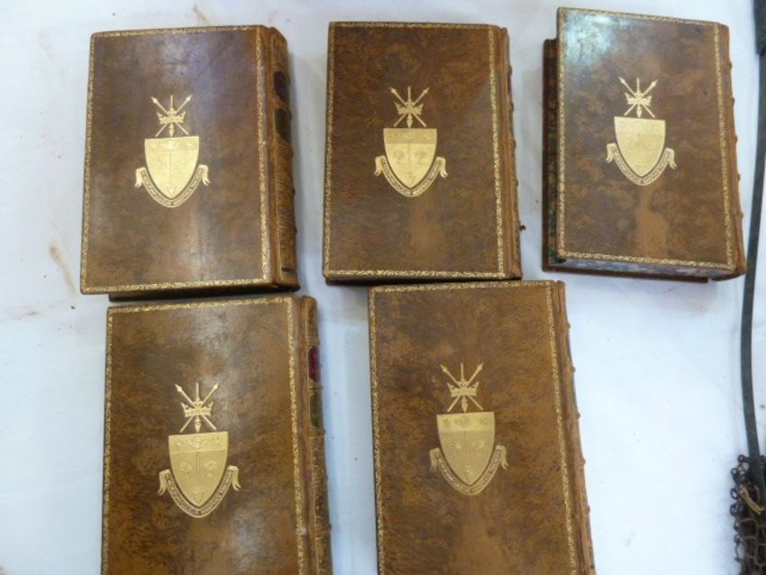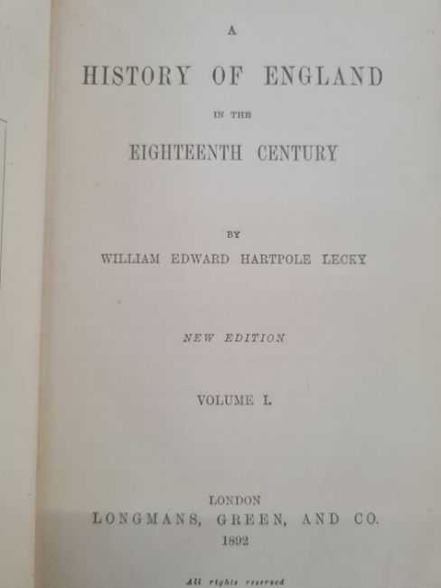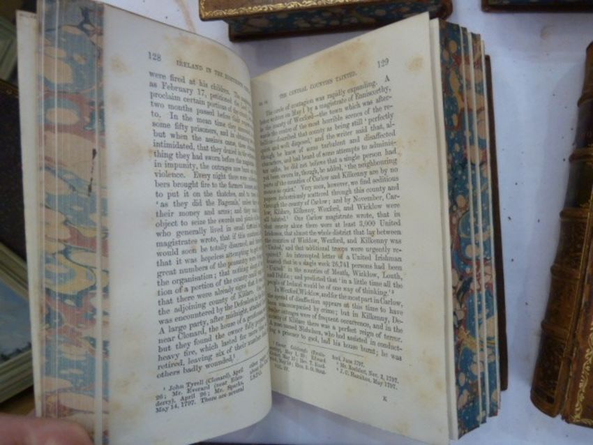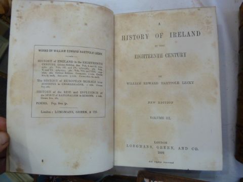 Fine Bindings -Lecky, William Edward Hartpole " A History of Ireland in the Eighteenth Century"  Longmans Green and Co. 1892 , 5 vols, full tree calf, armorial crest on front boards, marbled endpapers and marbled edges, gilt decoration and pastedown titles to the backstrip, with Lecky, William Edward Hartpole " A History of England in the Eighteenth Century" Longmans Green and Co. 1892, 7 volumes, marbled end papers , marbled edges, full tree calf, gilt armorial crest to front boards ( 12)BOOKS NOT COLLATED UNLESS OTHERWISE STATED, PLEASE ENSURE YOU ARE SATISFIED BEFORE YOU BID