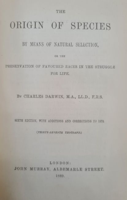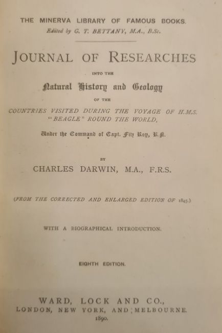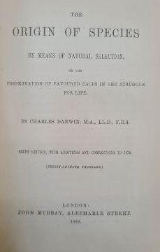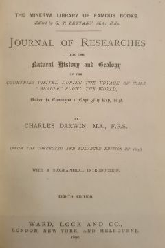Darwin, Charles "The Origin of the Species by Means of Natural Selection ...", John Murray 1889, 6th edition, folding plan, hinges cracked, binding tight otherwise, name inscribed in ink top right hand corner of ffep, offsetting on ffep, original green publishers cloth, blindstamped rules, gilt titles, corners rather bumped "Journal of Researches into Natural History and Geology, Countries visited during the Voyage of HMS Beagle around the World", John Murray 1890, new edition with frontis portrait, tissue guard to portrait, edges foxed, front hinge cracked, name inscribed in ink top right hand corner ffep, original publishers cloth, gilt titles and price on the backstrip, pictorial front boardDarwin, Charles"Journal of Researches into Natural History and Geology ...", Ward Locke & Co 1890 (The Minerva Library of Famous Books), frontis portrait, plates, blue publishers cloth, gilt titles, all rather bumped and wornFolio society Charles Darwin"The Descent of Man", within original slip case "The Voyage of the Beagle ...", by James Taylor, published Conway 2008, colour and other illustrations throughout, patterned ep, pictorial boards, with paper band across the boards (5)BOOKS NOT COLLATED UNLESS OTHERWISE STATED, PLEASE ENSURE YOU ARE SATISFIED BEFORE YOU BID