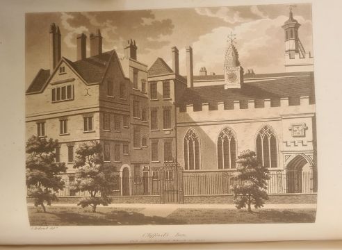 Ireland, Samuel " Picturesque Views with An Historical Account of the Inns of Court in London and Westminster" London R. Faulder and J. Egerton 1800 , half title, 21 aquatints in sepia ,foxing to endpapers, contents clean, rebound mottled morocco, raised bands with gilt rules and titles to backstripBOOKS NOT COLLATED UNLESS OTHERWISE STATED, PLEASE ENSURE YOU ARE SATISFIED BEFORE YOU BID