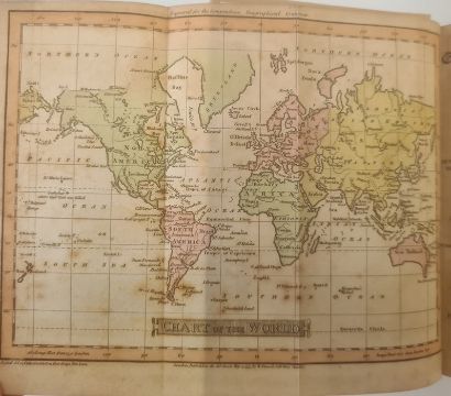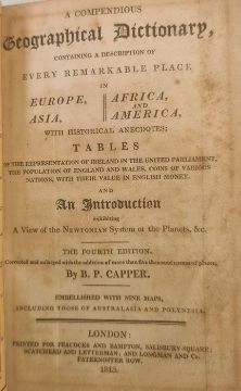 " A Compendious Geographical Dictionary containing Concise descriptions ....Europe, Africa and America..." W. Peacock and Sons 1804, world map folding frontis, numerous folding maps to include South America, ffep removed, contemp tree calf , 12. mo. gilt titles on red paste downs, gilt decorations withCapper B.P  " A Compendious Geographical Dictionary....Every Remarkable Place in Europe, Asia, Africa and America..."  Peacocks and Bampton 1813, coloured folding map frontis, various coloured folding maps engraved by John Russell, 12 in all though title page specifies nine, rebound in paper covered boards. title on pastedown on back strip, 12 mo. ( 2)BOOKS NOT COLLATED UNLESS OTHERWISE STATED, PLEASE ENSURE YOU ARE SATISFIED BEFORE YOU BID