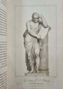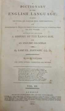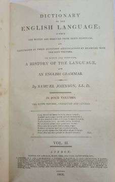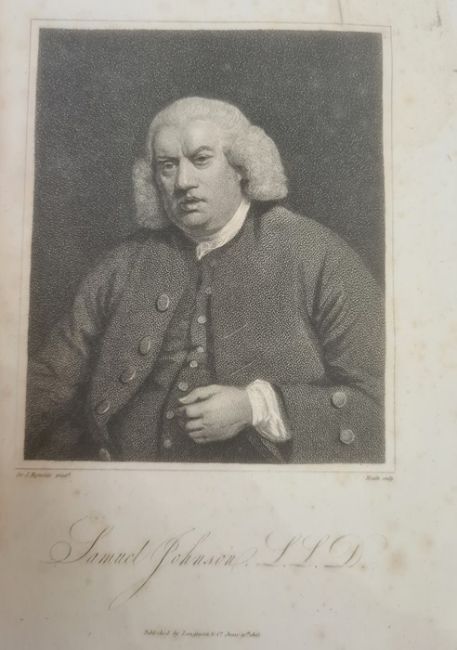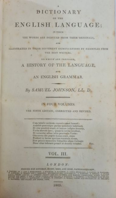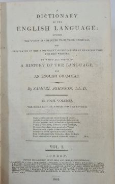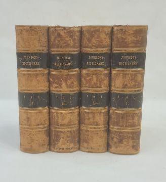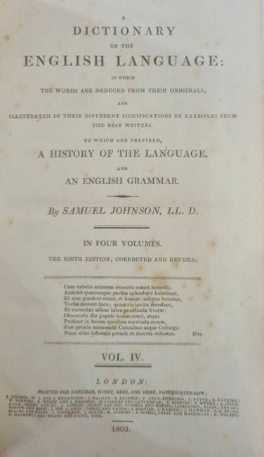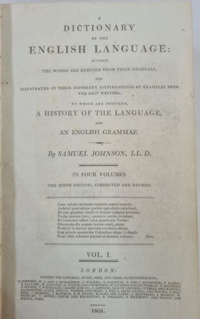 Johnson, Samuel "A Dictionary of the English Language ..., to which a prefix to history of the language and an English grammar", 4 vols, 9th edition, Longman Hurst Rees & Orme 1805, frontis portrait to vol 1, front hinge cracked in vol 1, contemporary half leather and boards, raised bands, gilt pastedown, titles to backstrips, but the leather all rather bumped and worn (4) BOOKS NOT COLLATED UNLESS OTHERWISE STATED, PLEASE ENSURE YOU ARE SATISFIED BEFORE YOU BID