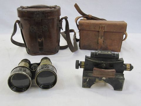 WWI era binoculars in leather case stamped with broad OA together with artillery clinometer stamped F.B.P. in leather case