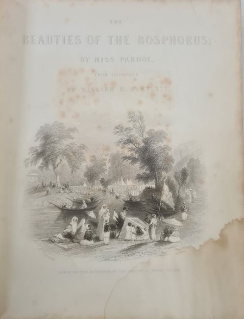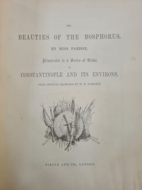 Pardoe, Miss ( Julia) Bartlett William Henry ( ills) " The Beauties of the Bosphorus Illustrated in a Series of Views of Constantinople and its Environs "[ c.1850-1855] , Virtue and Co. vignette on title page, steel engraved plates, two portraits and a map, water stain to half title and frontis, occasional browning , plates clean. front hinge cracked, marbled boards and half leather, rather wornBOOKS NOT COLLATED UNLESS OTHERWISE STATED, PLEASE ENSURE YOU ARE SATISFIED BEFORE YOU BID