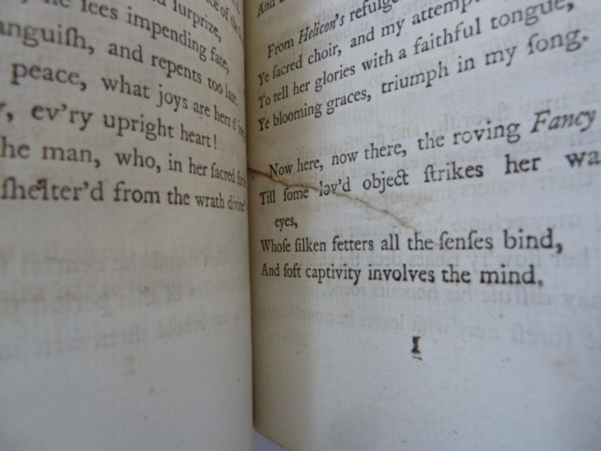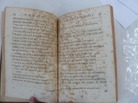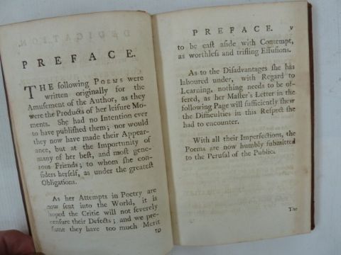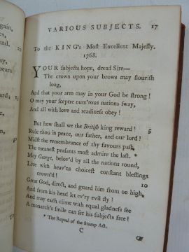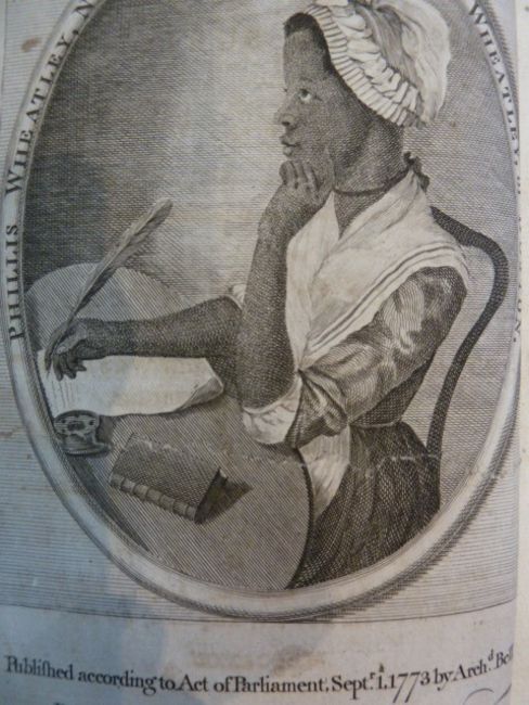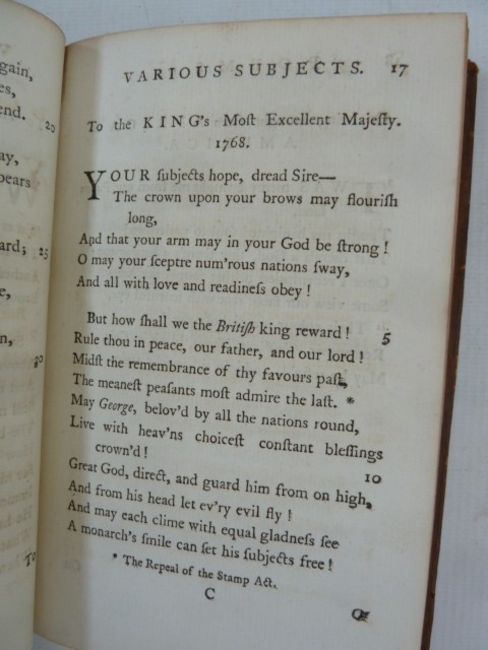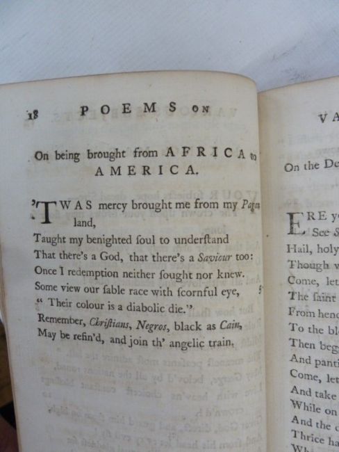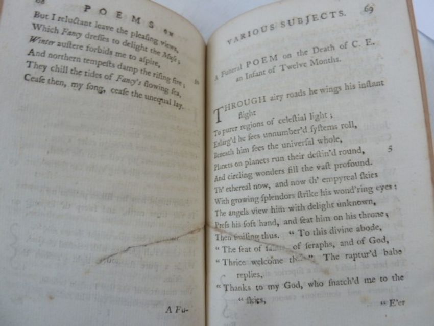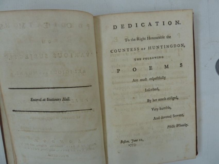 Wheatley, Phillis " Poems on Various Subjects, Religious and Moral by Phillis Wheatley, Negro Servant to Mr John Wheatley of Boston, New England"  London, printed for A. Bell. Bookseller Aldgate and sold by Messrs Cox and Berry, King - Street, Boston ,engraved portrait frontis of Phillis Wheatley, titled 'Phillis Wheatley Negro Servant to Mr John Wheatley Published According to Act of Parliament Sept. 1st 1773 by Arch'd Bell, Bookseller no 8 by the Saracen's Head. Aldgate. Faint offsetting from the frontis onto title page, foxing between pages 39-52, dedication to 'The Right Honourable Countess of Huntingdon the Poems are most Respectively inscribed by her much obliged, very humble and devoted servant Phillis Wheatley June 12 1773' , some staining to edges of endpapers, contemp full calf, full calf, gilt titles , faded, gilt dentelles to edges of boards 15.75 x 12 cms, a slender volumeplease note also so odd marks in centre pages, not loss, please see images, engraved frontis portrait has been laid down as there has been a tear across the lower part of the page. Expertly repairedc.f. The New Yorker,  Elizabeth Winkler,  July 30th 2020      Poets.org - Phillis Wheatley      East End Women's Museum, Phillis Wheatley -The First Published Black Woman PoetIn 1773, Phillis Wheatley accomplished something that no other woman of her status had done. When her book of poetry, Poems on Various Subjects, Religious and Moral, appeared, she became the first American slave, the first person of African descent, and only the third colonial American woman to have her work published.Originally from Bowden Hall, Upton St Leonards, GloucestershireDear Customer, in order to comply with Anti Money Laundering Regulations, please contact the auctioneer before bidding on this lot. BOOKS NOT COLLATED UNLESS OTHERWISE STATED, PLEASE ENSURE YOU ARE SATISFIED BEFORE YOU BIDCondition Reportplease see all images and text