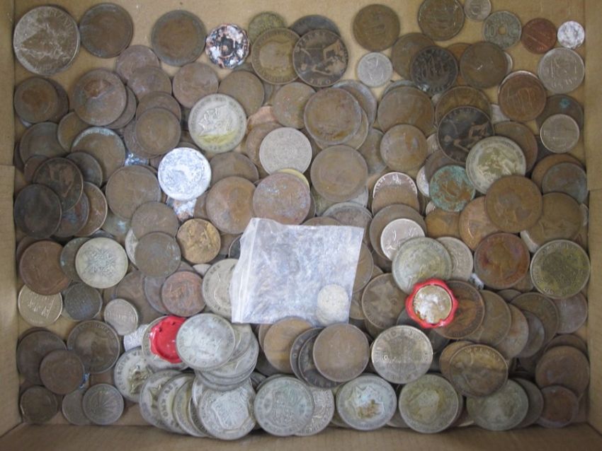 Box of silver pre-1947 silver and pennies and some foreign coins