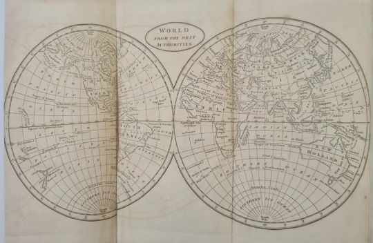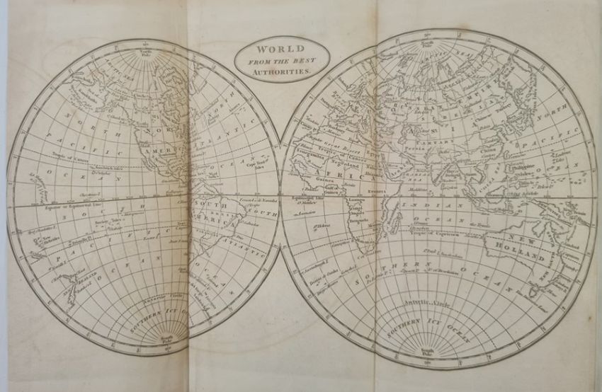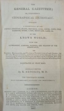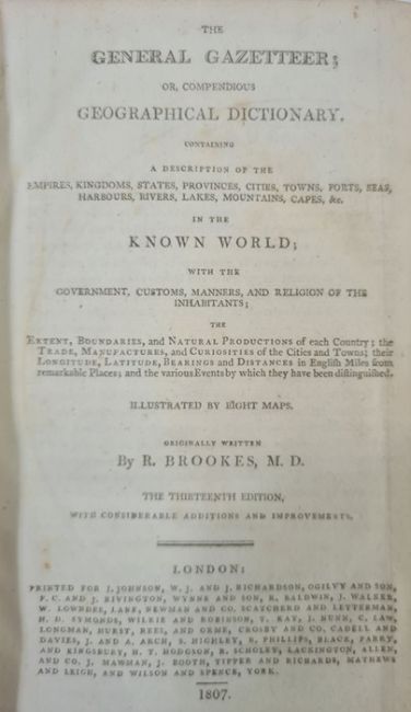 Brooks, R M D "The General Gazetteer; or Compendious Geographical Dictionary ...", 13th edition, London 1807, printed for J Johnson, W J & J Richardson, Ogilby & Sons, etc, folding double page map of the world frontis, 8 folding maps, contemporary full tree calf, raised bands to backstrip and red pastedown with titles, browning to ep, world map outer edge a little creased and in the fold, BOOKS NOT COLLATED UNLESS OTHERWISE STATED, PLEASE ENSURE YOU ARE SATISFIED BEFORE YOU BID