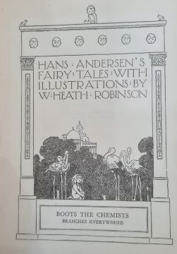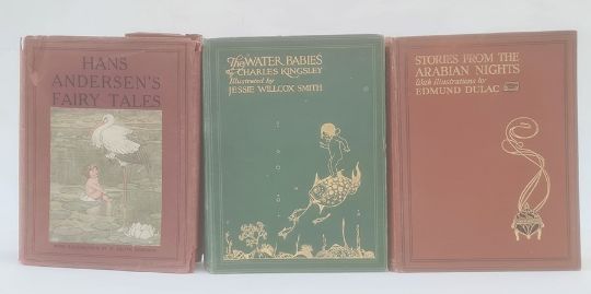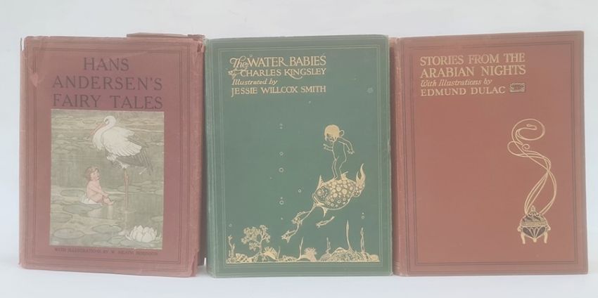 Dulac Edmund (ills) " Stories from The Arabian Nights" Hodder and Stoughton for The Boots Drug Company n.d. col frontis tipped in, col plates tipped-in, inscription inside front board dated 1931, rust coloured cloth with gilt titles and decoration, Willcox Smith Jessie "The Water-Babies by Charles Kingsley" Boots the Chemist, col frontis with tissue guard, col plates tipped-in, with tissue guards, front hinge cracked, creasing of the tissue guard to frontis and early pages lower left corner, green pictorial cloth , Heath Robinson W. (ills) " Hans Andersen's Fairy Tales" Boots the Chemist n.d. col frontis tipped in, col plates tipped in, rust coloured cloth with gilt titles and decorations , dust jacket , repaired ( 3) ALL PLATES PRESENT IN ALL THREE BOOKSBOOKS NOT COLLATED UNLESS OTHERWISE STATED, PLEASE ENSURE YOU ARE SATISFIED BEFORE YOU BID