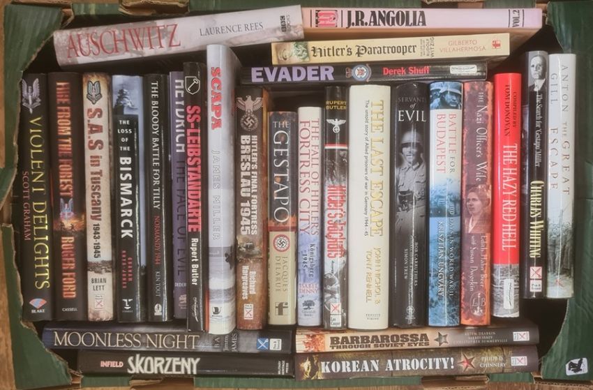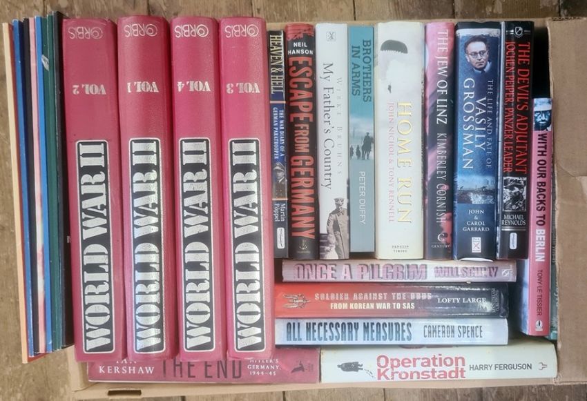 Militaria, three boxes of books mainly on the subject of WWII, to include Brian Lett "SAS in Tuscany 1943-1945", published Pen & Sword, Laurence Rees, Ian Kershaw "The End: Hitler's Germany 1944-45", published Allen Lane, etc (3 boxes) BOOKS NOT COLLATED UNLESS OTHERWISE STATED, PLEASE ENSURE YOU ARE SATISFIED BEFORE YOU BID