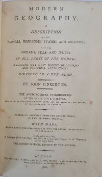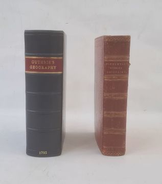 Pinkerton, John " Modern Geography. A Description of the Empires, Kingdoms, States and Colonies....Astronomical Introduction by the Rev. S Vince...." London T Cadell and W Davies 1806, Second Edition, 15 folding maps, contemporary red crushed morocco , gilt rules,  blind stamp borders to front and back boards, dentelles,  raised bands and gilt titles, backstrip worn, aeg.withGuthrie William " A New Geographical, Historical and Commercial Grammar; and Present State of the Several Kingdoms of the World....." London, Charles Dilly and G.G. and J. Robinson 1795, 22 folding maps, to include folding frontis and one plate, ink name of ffep, rebound in blue morocco over marbled boards, raised bands and gilt title on red pastedown, marbled endpapers (2)BOOKS NOT COLLATED UNLESS OTHERWISE STATED, PLEASE ENSURE YOU ARE SATISFIED BEFORE YOU BID
