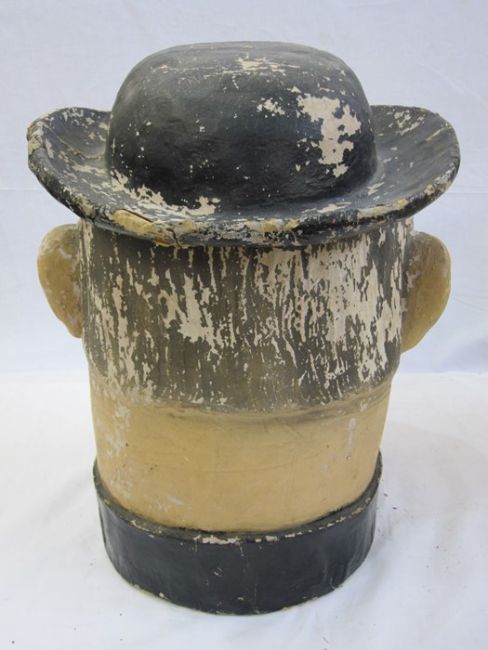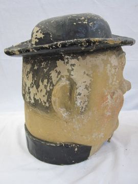 An early to mid 20th century painted Papier Mâché Carnival Parade Head in the form of a Gentleman in a flat bowler hat, unverified but possibly produced by Barnums Carnival Novelties of Hammersmith, London, 40cm high approx.