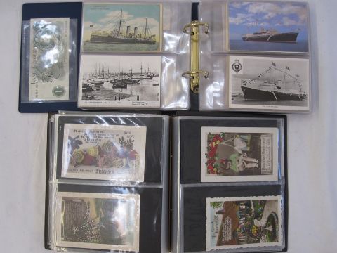 Two albums of mainly early to mid 20th century postcards, including Christmas and New Year street scenes