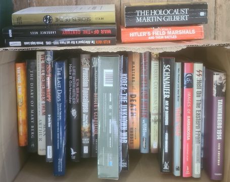 Militaria, three boxes of books mainly on the subject of WWII, including Tim Bean and Will Fowler "Russian Tanks of World War II", Ian Alan, Carl Bahm "Berlin 1945 - The Final Reckoning", published Pen & Sword, Jason Turner "Stalingrad Day by Day", published Pen & Sword (3 boxes)BOOKS NOT COLLATED UNLESS OTHERWISE STATED, PLEASE ENSURE YOU ARE SATISFIED BEFORE YOU BID