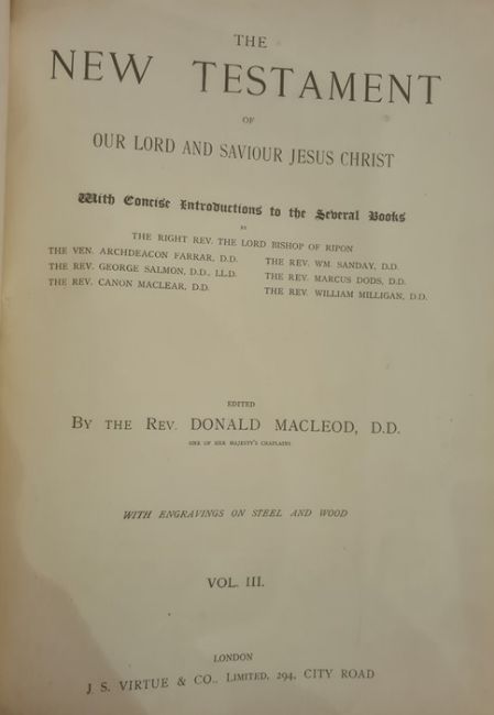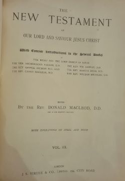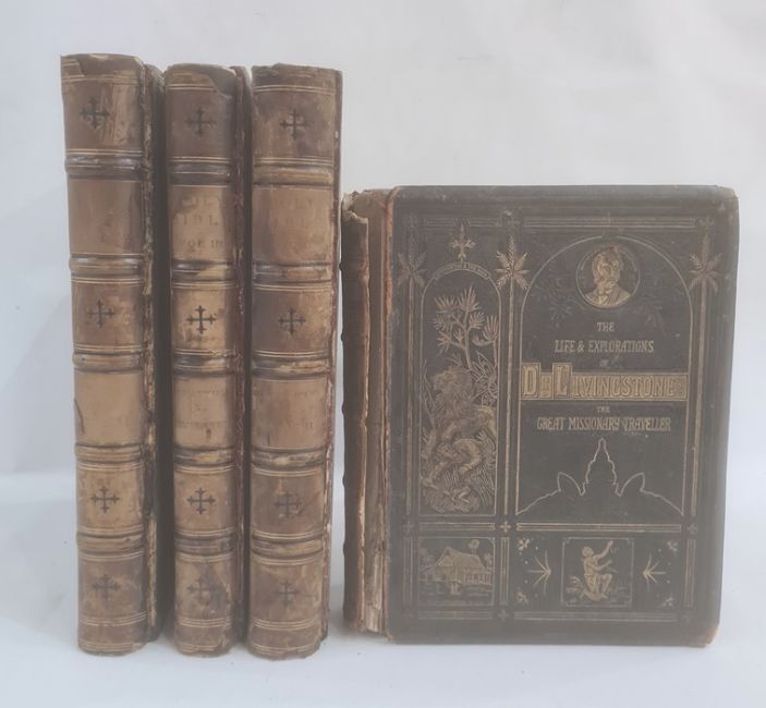 Macleod, Rev Donald (ed)"The Holy Bible", 3 vols, J S Virtue & Co, numerous engraved plates, illustrations throughout, marbled ep, hinge reinforced, full leather, backstrip showing signs where front boards had separated, a.e.g., elephant folio"The Life and Explorations of Doctor Livingstone LLD", J G Murdoch, n.d., sepia plates, colour tp, full morocco, with blindstamped , gilt decorations and titles, front board detached, backstrip detaching and has loss (4) BOOKS NOT COLLATED UNLESS OTHERWISE STATED, PLEASE ENSURE YOU ARE SATISFIED BEFORE YOU BID
