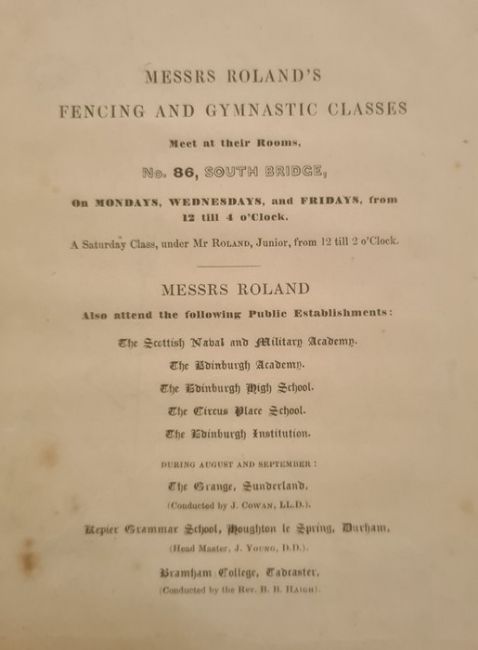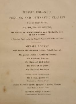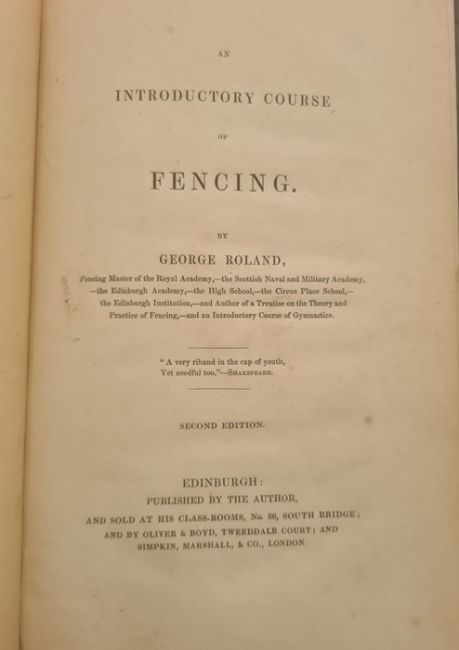 Roland, George " An Introductory Course of Fencing" Second Edition ( 1830?)  Edinburgh Published for the Author. 5 plates, original cloth, blind stamped with gilt decoration to front board, name in ink on ffep and inside front boardBOOKS NOT COLLATED UNLESS OTHERWISE STATED, PLEASE ENSURE YOU ARE SATISFIED BEFORE YOU BID