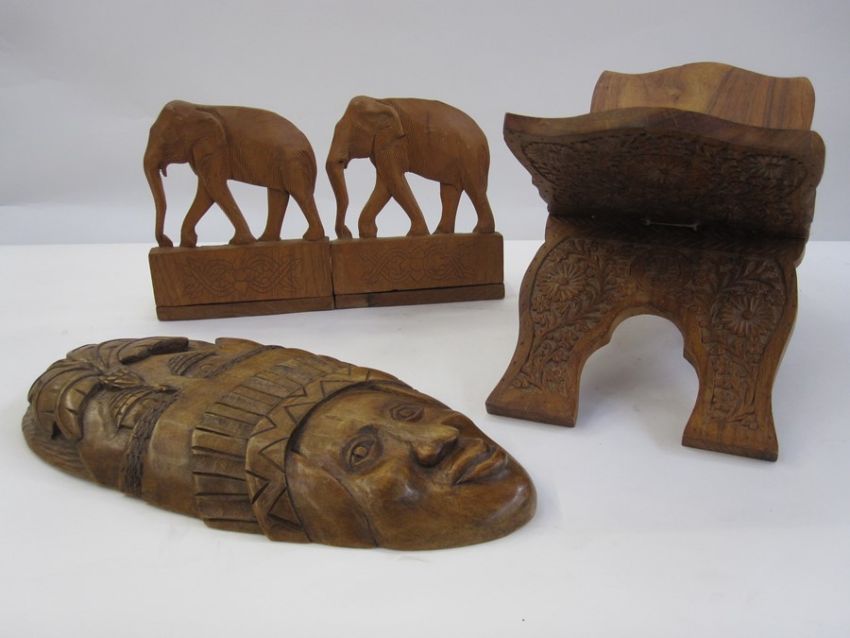 Pair of carved African elephant bookends, a carved book stand and a mask with palm trees (4)