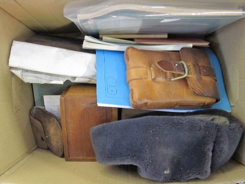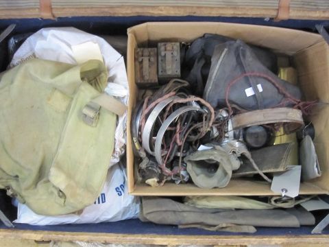Trunk containing two gas masks, shell case, canvas, ruck sack and bags, sand bags, WWII air ministry oxygen skin mask and radio head phones and a box of other military items
