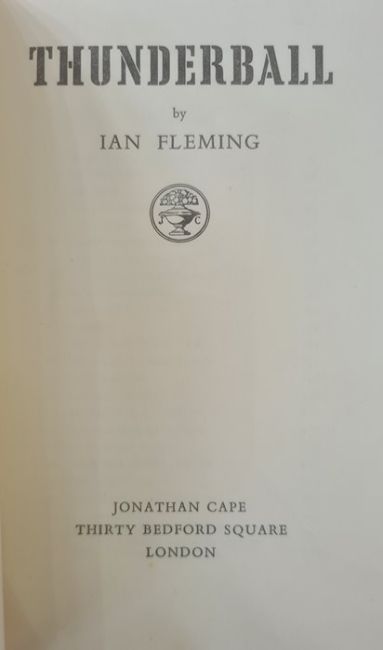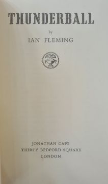 Fleming, Ian"Thunderball", Jonathan Cape 1961, white ep, blindstamped shadow of a skeleton hand, gilt titles to backstrip, dj price clipped, the black boards faded and rather bumped and worn, rubbing out of pencil name on ffep, with another copy, Jonathan Cape 1961, no dj, bottom of the backstrip separating (2) BOOKS NOT COLLATED UNLESS OTHERWISE STATED, PLEASE ENSURE YOU ARE SATISFIED BEFORE YOU BID