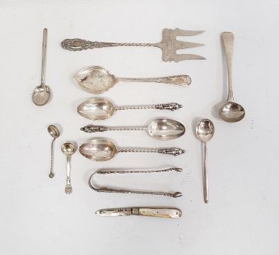 Three Victorian silver apostle spoons, Birmingham 1898, 1.5 ozt. approx. a pair 1930s teaspoons, Sheffield 1931, 0.3 ozt, assorted spoons, fork and a pair of sugar nips