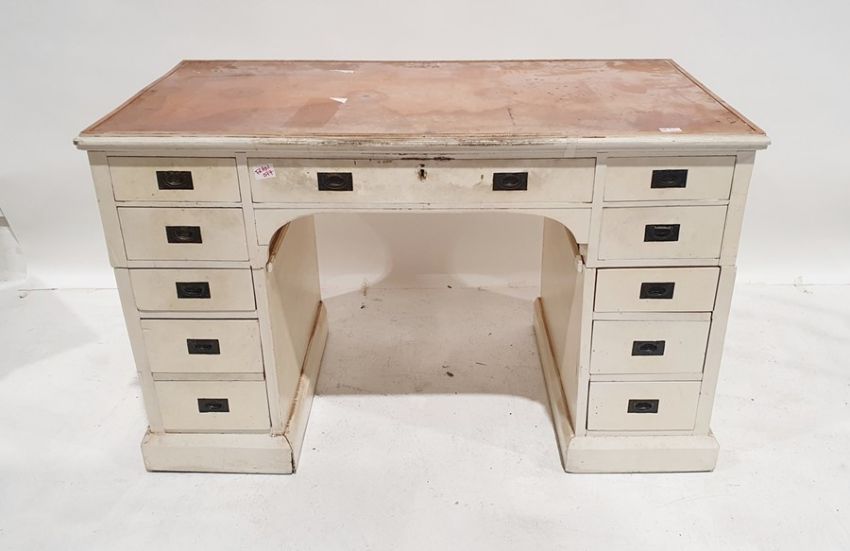 Early 20th century white painted pedestal desk, with campaign-style handles, 11 assorted drawers, on plinth base, 121cm x 76cm