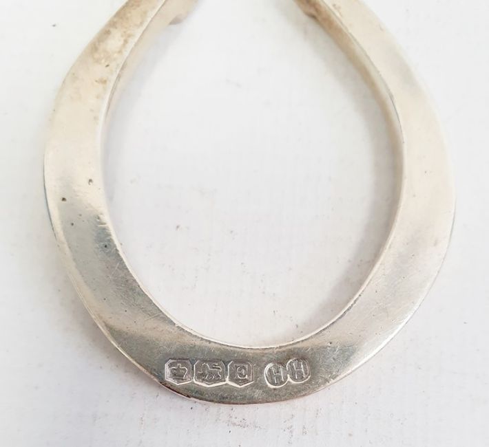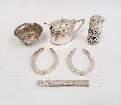 Pair of 1940's silver horseshoes, Sheffield 1947, maker H Hunt, a silver-mounted pepperette with blue glass liner and pierced decoration, a silver salt repousse decorated, Birmingham 1901 and two other items (6)