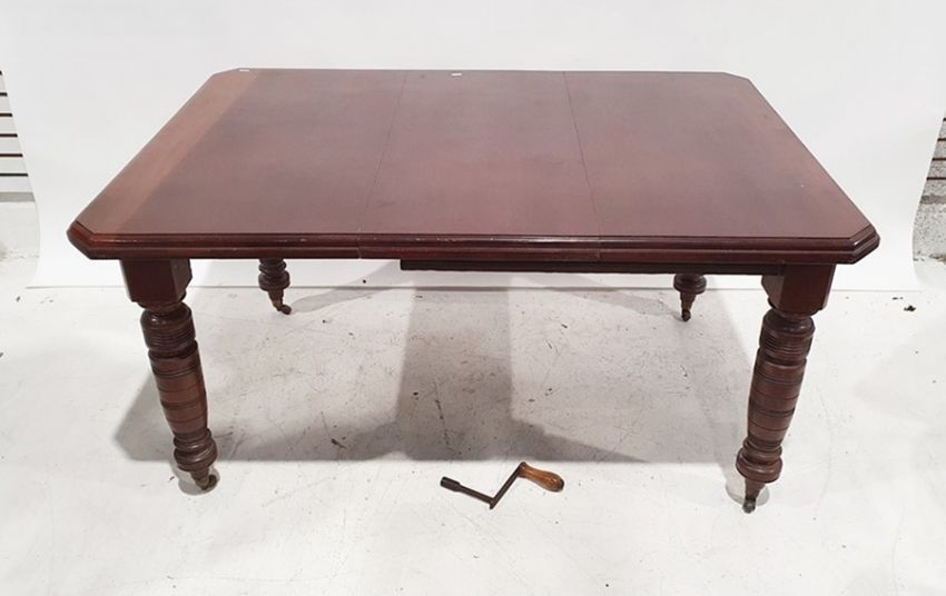 Late Victorian mahogany extending dining table, the rectangular top with canted corners and moulded edge, on turned supports to brown china castors