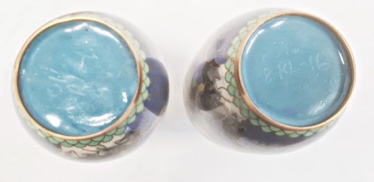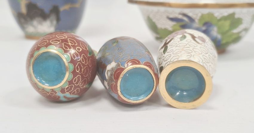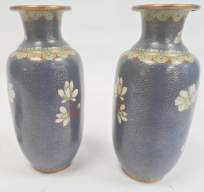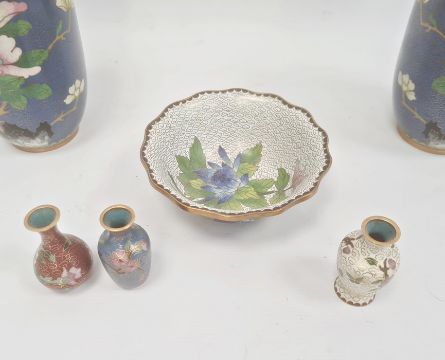 Pair Japanese cloisonné enamel vases of rouleau form, flowering peony on a blue enamel and cloud scroll design, 21cm, three miniature cloisonné vases and a small cloisonné enamel bowl (6)