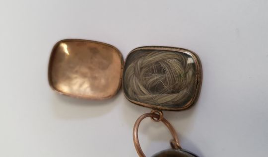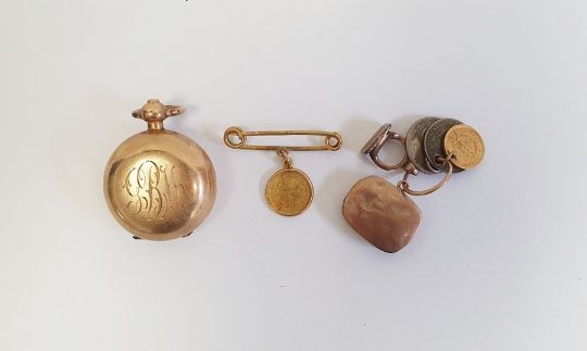 19th century gold-coloured memorial locket, of plain rectangular form containing hair, on a suspension ring hung with a seal fob and coins, including an 1854 gold one dollar, a gold-coloured bar brooch hung with an 1853 gold one dollar coin and a gold-plated sovereign case (3)Condition ReportTotal Lot Weight= 37.3gCoin is gold, rest of brooch does not appear to be.