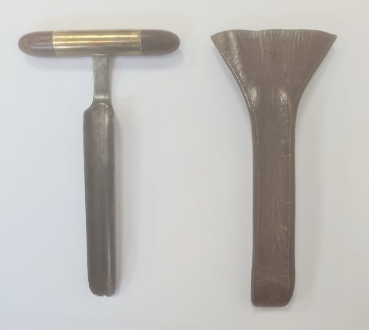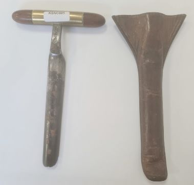 Antique wooden handled and brass mounted metal cheese wheel sampler in leather case, no. 3 to leather case and indistinctly marked to the metal