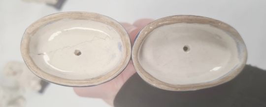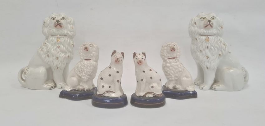 Pair Staffordshire pottery spaniels with gilt highlights, 16cm high, pair smaller Staffordshire pottery spaniels, each on blue plinth base and pair Staffordshire pottery cats with lustre highlights (some damage) (6)