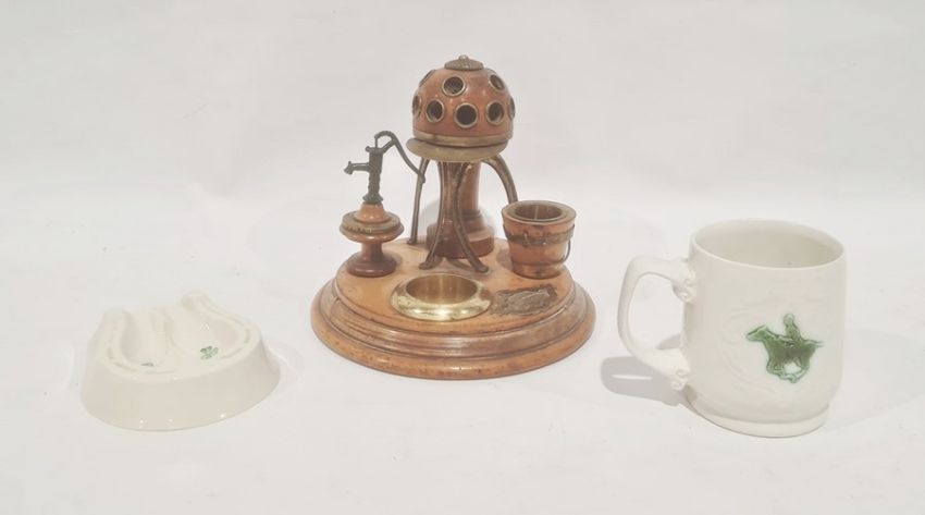 Racing interest: novelty wooden and brass mounted horse racing inkwell, a Belleek horseshoe and clover ashtray and a Little Orchard pottery horse racing mug (3)