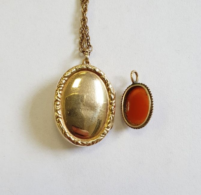 9ct gold oval locket decorated with seedpearls and turquoise, on a gold-coloured chain and a gold cameo pendant carved with a portrait of a Tudor lady in ropetwist mount, marked 9ct, total weight approx 9.5g Condition ReportSee photos